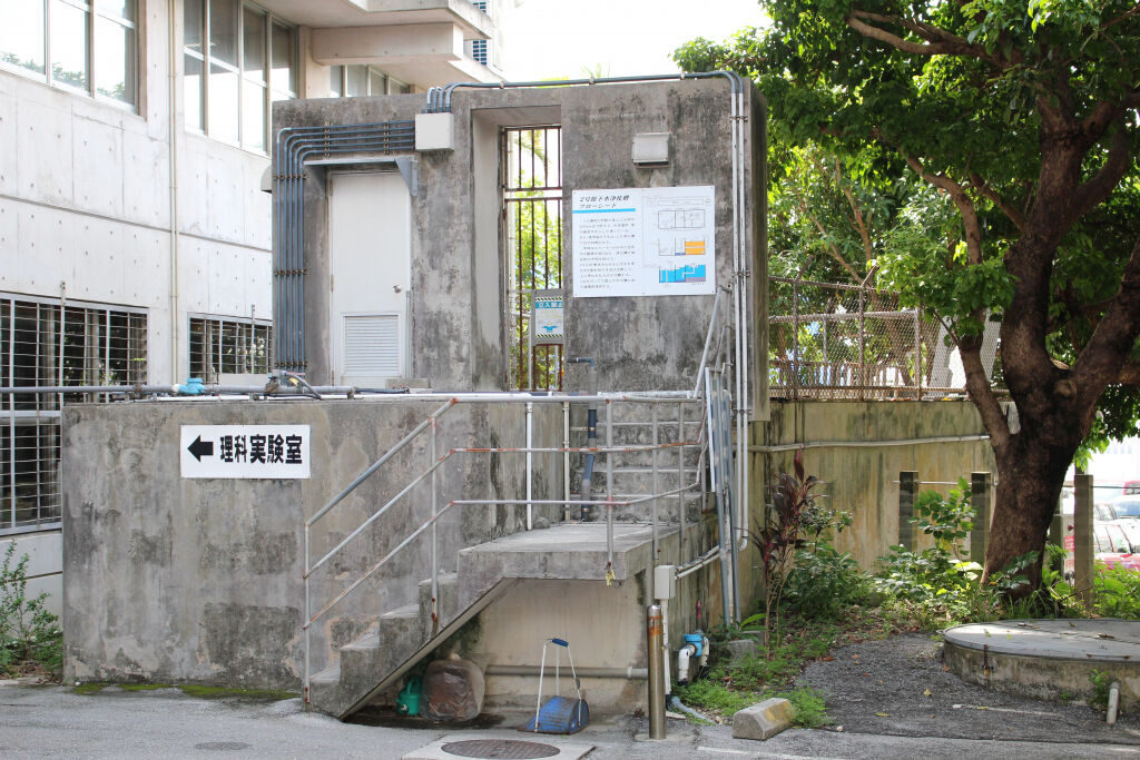 2号館および3号館のトイレの水は雨水と2号館横にある汚水処理施設によって処理された水が使用されています。水不足の時は多少汚れていることがありますが、水問題が深刻な沖縄では特に大事な取り組みです。