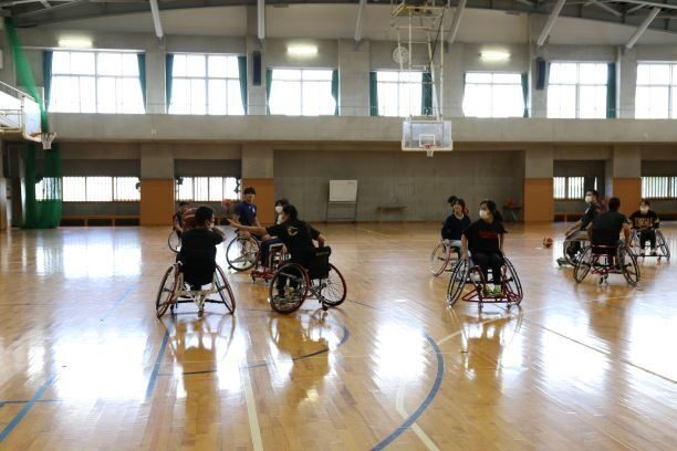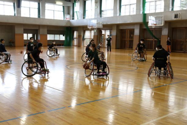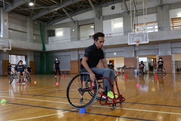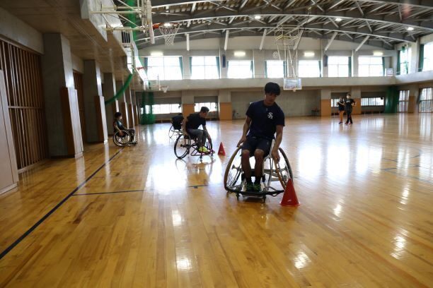 最初に車いすの使い方を学び、ジグザグ走行の練習を行ったり試合に備えます。学生たちは講義でも車いすを数回利用したことがあることや、学生たちは健康スポーツ福祉専攻に所属しているため高い身体能力を持っていることもあり、少しの練習時間で車いすを使ってドリブルができるようになるなど試合に向けての技術を短時間でマスターしていました。