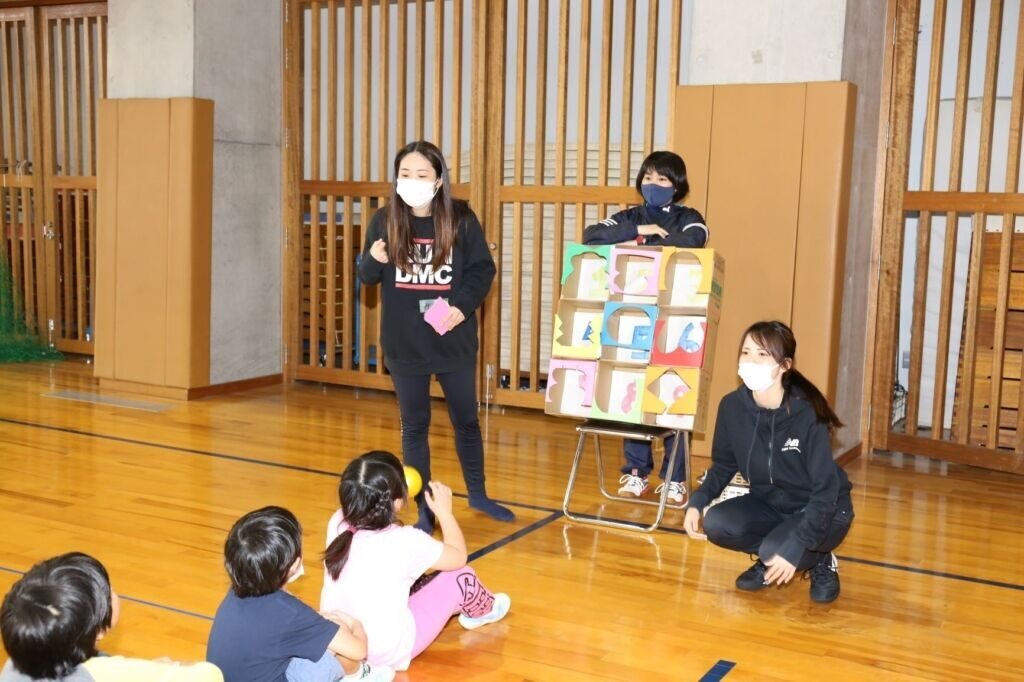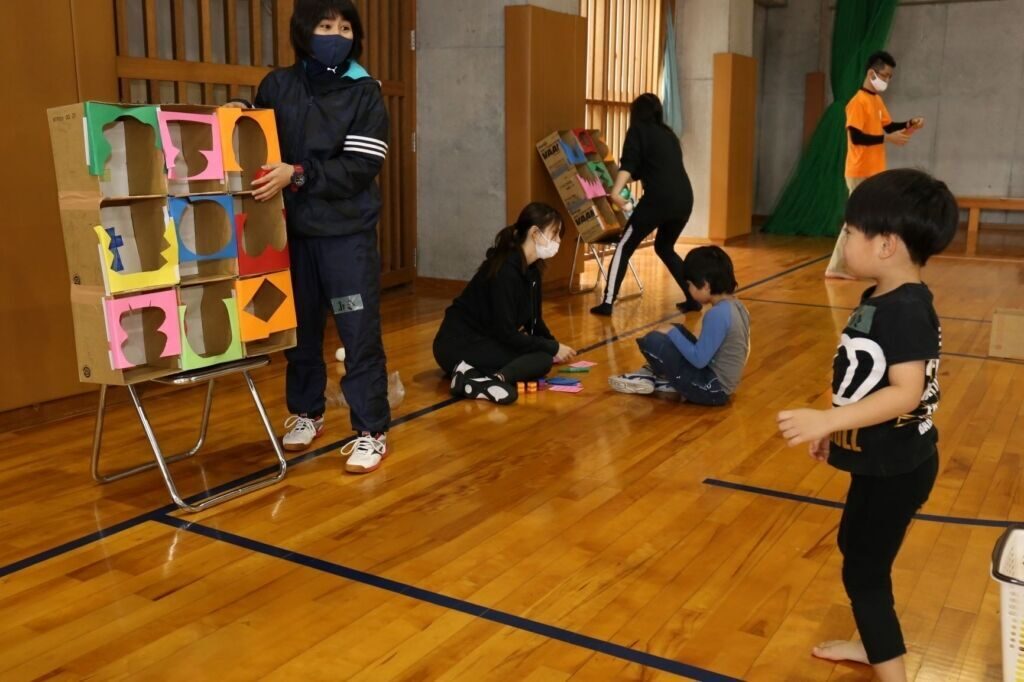 第5回となる3月13日の教室では、学生たちがこれまでの教室を通して学習してきたことを活かす集大成として、学生たち自身が企画した運動プログラムを、放課後等デイサービスに通う子どもたちに提供し交流を行いました。学生たちは12月から、授業のみでなく自主的に集まりながら準備を進め、この日に向けてプログラムを作成。「子どもたちに『できた』という喜びと達成感を味わってもらう」ことを目標に子どもたちが飽きない工夫等を重ねたといいます。