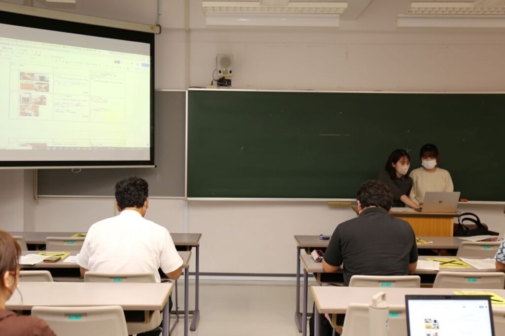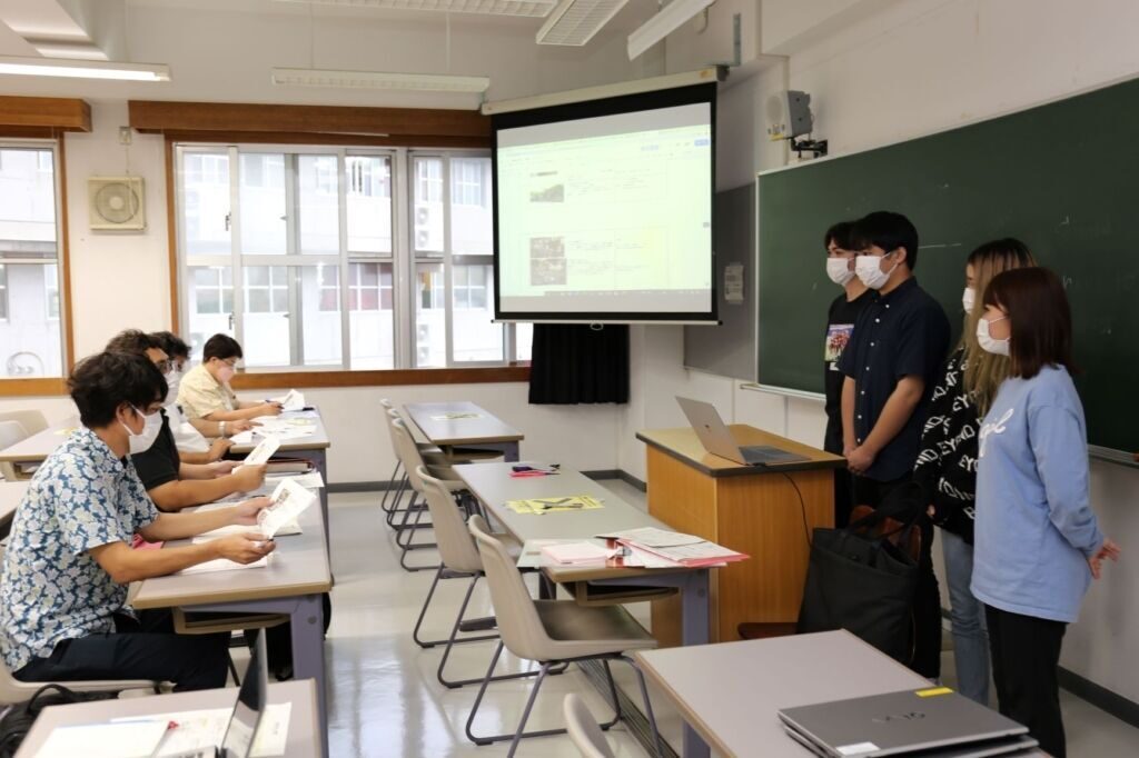 今回、末吉ゼミでは4グループに分かれて、外国人に向けて那覇の魅力を紹介する動画作成を行います。那覇市内の観光スポットのなかでも学生が特に紹介したい場所や体験型の観光スポット等を撮影し、英語での説明をつけていく予定です。11月10日3限に行われた講義では、那覇市観光協会や映像制作会社の方々をお招きして、今月から始まる撮影作業に向けてのプレゼンテーションを行いました。学生が練った絵コンテを提示しながら、伝えたいことをより分かりやすくするにはどうすればいいか、撮影のプロの方たちからアドバイスが行われました。