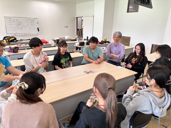 福祉文化学科、名城健二先生のゼミ(3年4年合同ゼミ)では、一昨年から児童福祉事業所「グットトライ」(嘉手納町)との交流を継続していて、今日(5月16日)は事業所に通っている中高校生5人が沖縄大学に来て、ゲーム等を楽しみました。名城先生は一昨年9月から嘉手納町と連携し、経済的に厳しい家庭や不登校、ヤングケアラーなど行政による既存の支援事業が届きにくい児童生徒を対象に支援をすすめる活動を行っていて、その連携事業の一環です。