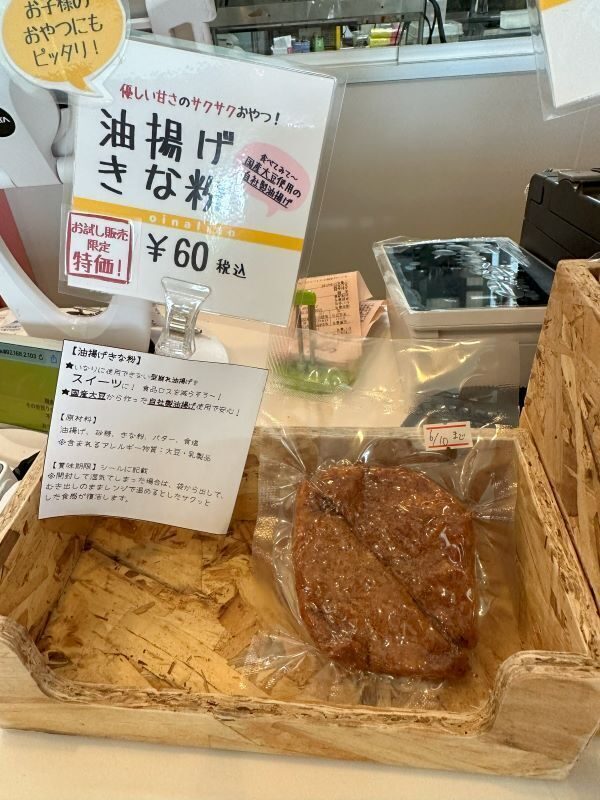 そのひとつ「油揚げきなこ味」が、5月中旬よりテスト販売中、店頭に並んでいます。取材に伺ったこの日は残り1つになっていて、リピーターも出始めているとのこと。来年3月までにパッケージやネーミングを考えて、正式販売されるそうです。オイナリアン代表の吉里時治さんは、「1つ60円というお求めやすい価格で、栄養のバランスもよく美味しいので是非売れてほしい」と期待を寄せています。実際に試食してみると、どこか懐かしくほっとするお味でした。是非、お試しください。