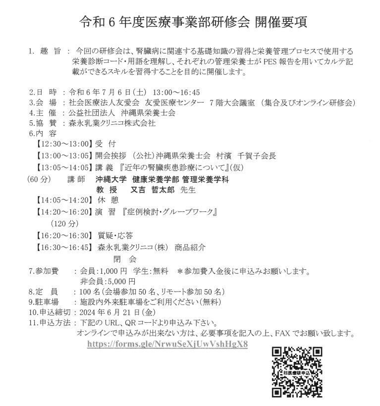 沖縄県栄養士会主催の医療事業部研修会にて管理栄養学科教授の又吉哲太郎先生が講義を行います。