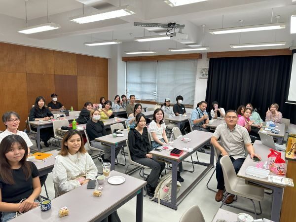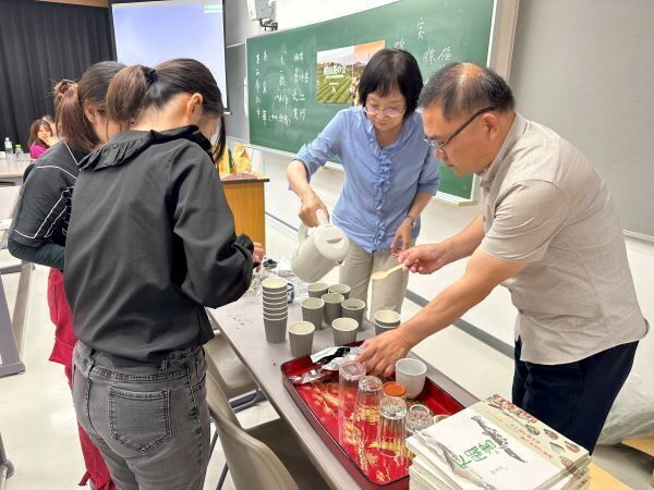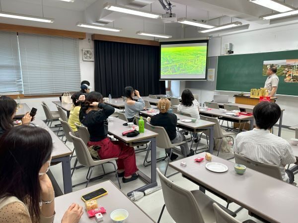 講演では青島市や「崂山茶」の歴史・文化について紹介しながら、お茶の栽培や製造技術、お茶の淹れ方、飲み方について説明いただきました。古来、中国茶はシルクロード、茶馬古道などの貿易ルートを通じて世界各地に伝播し、各国の茶文化と交流し、融合し発展してきました。中国の人々にとって、お茶は飲み物だけでなく、文化、精神的なシンボルの一つになっていることなどお話しいただきました。講義後半は国際コミュニケーション学科のクリス先生のゼミ生や教職員も参加し、美味しいお茶と閻先生の楽しいお話しに、会場は和やかな雰囲気に包まれていました。