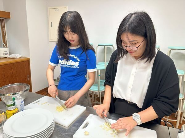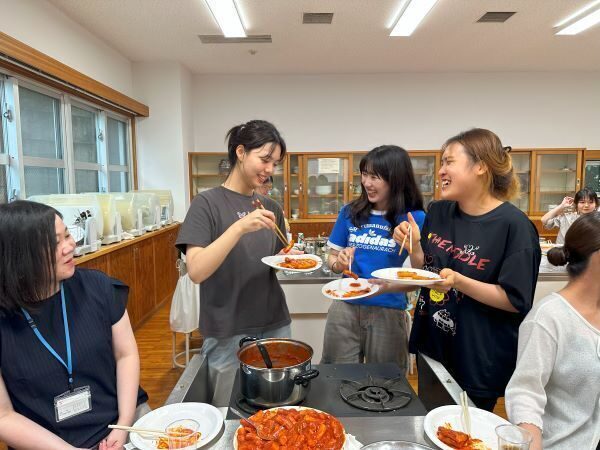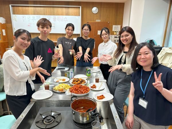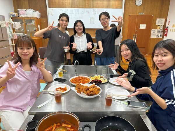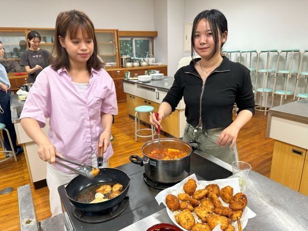 今回は『韓国編』で韓国の学生が授業の帰り道などに日常的に食べるというスナック2品(トッポキ、ハニーコンポチキン)を協定校である聖公会大学から来ているヘリンさんとユンソンさんが教えてくれました。食材は韓国で使われている材料を用意して調理を行い、各班オリジナルで味をつけ、それぞれの班の味の違いを学生たちは楽しんでいました。ユンソンさんは、「韓国の屋台の味に似ていて、どの班も美味しくできています」と感想を話してくれました。