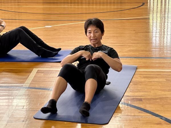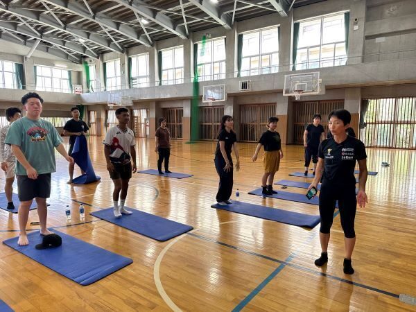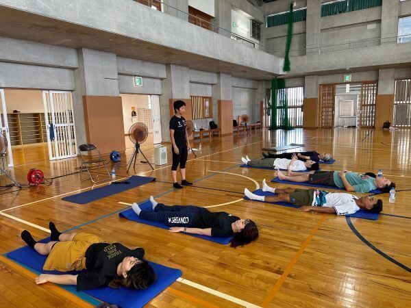 講演ではトライアスロン競技をはじめたきっかけや「健康に運動を続ける」ことを第一にサポートを続けている現在のお仕事についてお話しいただきました。その後は実際に軽いトレーニング指導を行っていただき、受講者に姿勢づくりや体幹を鍛えるコツについて教えていただきました。どのスポーツも体幹がとても大切で、腹筋の上部と下部の使い方、そしてジョイントさせて鍛えることにより、競技のパフォーマンス向上が狙えるそうです。部活に日々取り組んでいる学生も自身が腹筋を使えていないことを改めて気づいた様子でした。