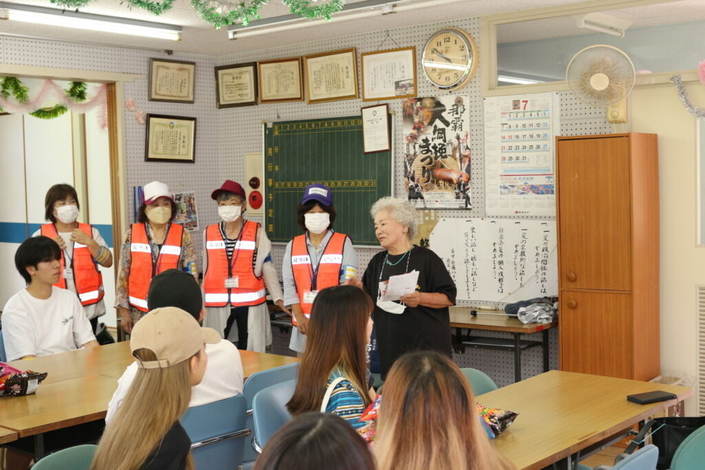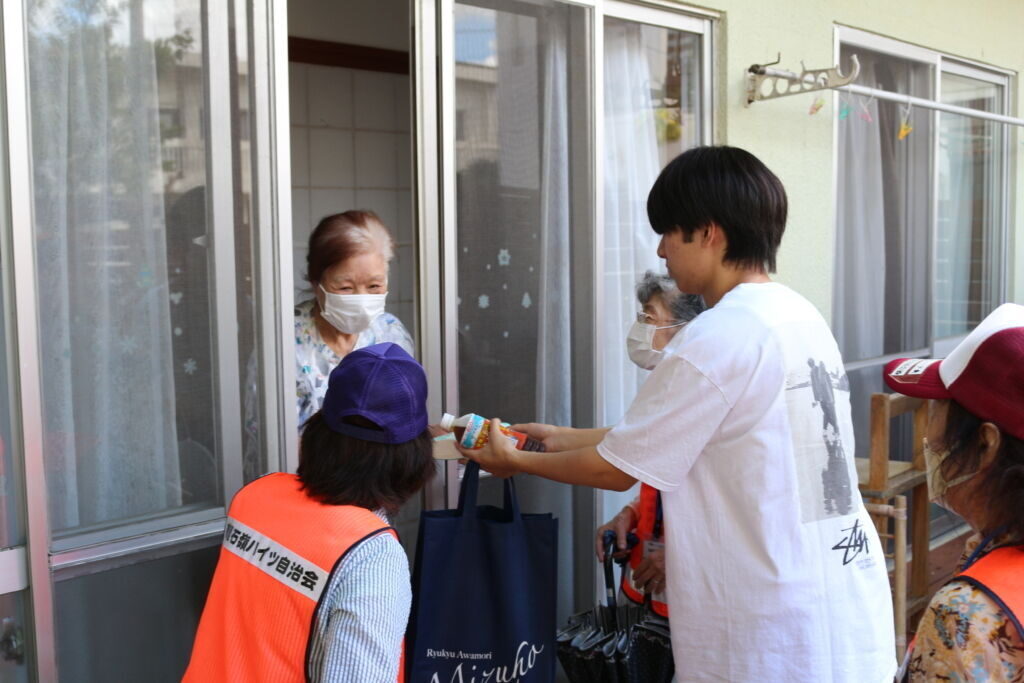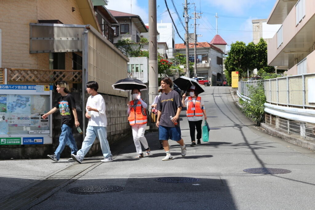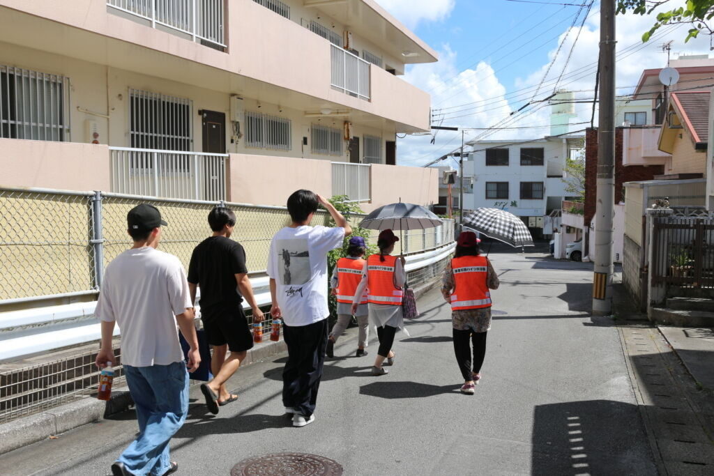 7月11日、「なはユース自治大学」に取り組む経法商学科の島袋ゼミは、那覇市の石嶺ハイツ自治会(末吉ヒサ子会長)の地域の高齢者の見守りボランティア「地域見守り隊」の活動に参加しました。