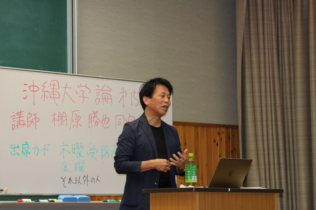 7月18日、「沖縄大学論」のゲスト講師に琉球朝日放送編成局長で沖縄大学同窓会長も務めておられる棚原勝也氏をお招きしました。