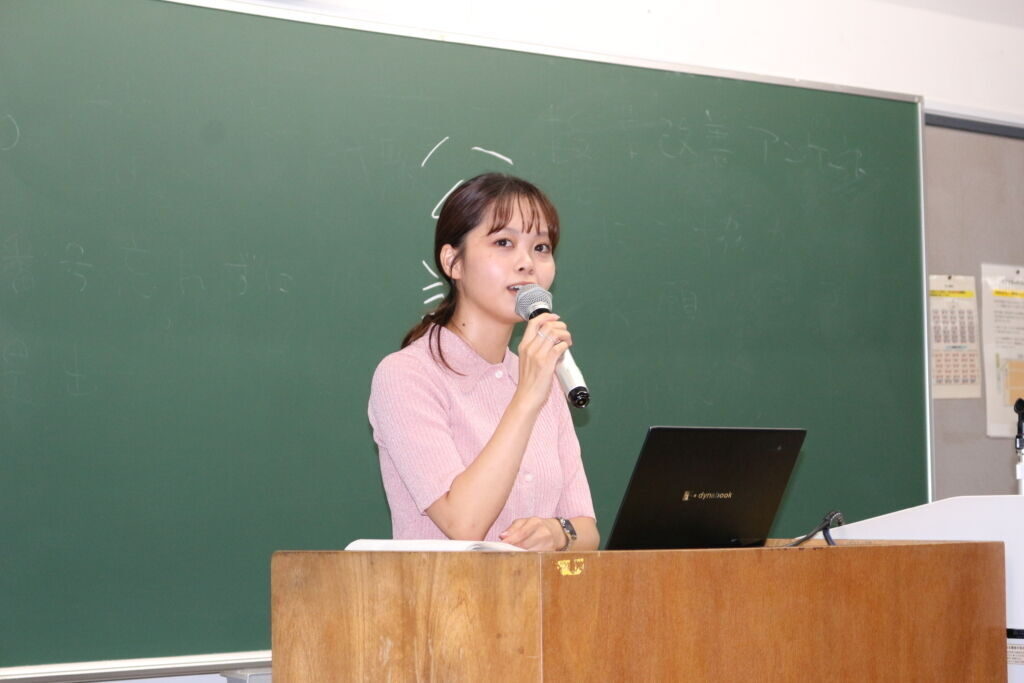 7月29日、「ジャーナリズム論(若林千代教授)」の最終回のゲスト講師に沖縄タイムス社会部記者(気象担当)の末吉未空氏をお招きしました。末吉氏は2024年3月に国際コミュニケーション学科を卒業した本学出身者です。