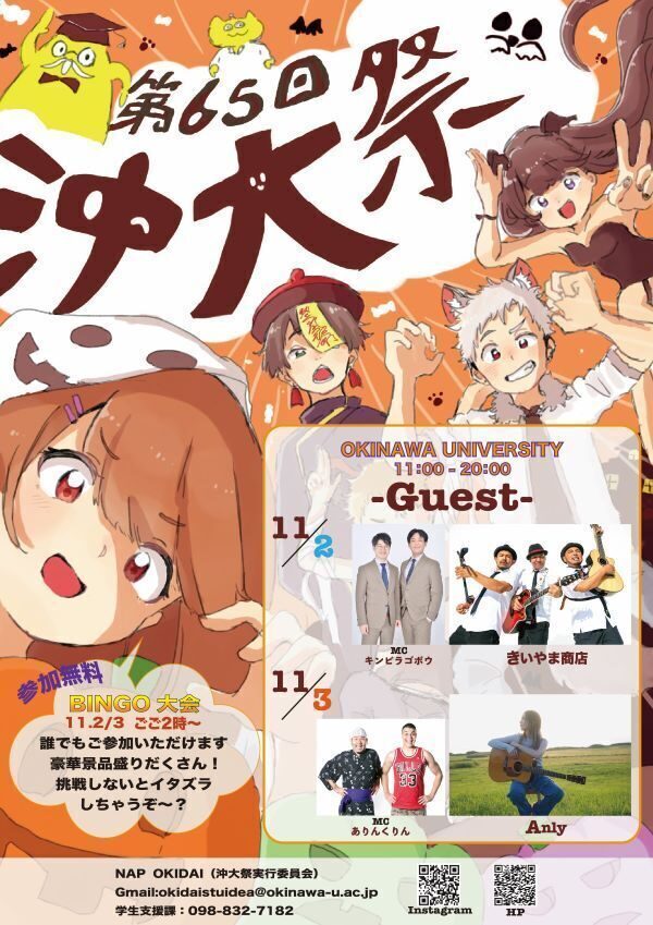今年の沖大祭のテーマは「エンジョイ、ハロウィン、沖大祭」です。豪華景品があたるビンゴ大会が2日間開催、ライブパフォーマンスでは「きいやま商店」や「Anly」さんのライブが予定されています。学生のみなさん、また地域の皆様、是非、沖大祭に足を運んでください。