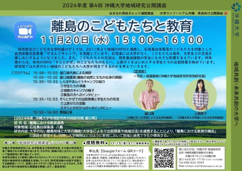 第4回沖縄大学地域研究公開講座「離島のこどもたちと教育」開催のお知らせ 11月20日(水)15:00~16:00