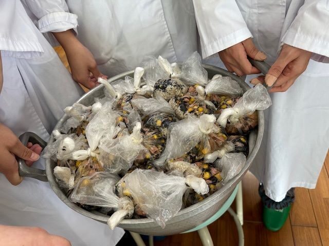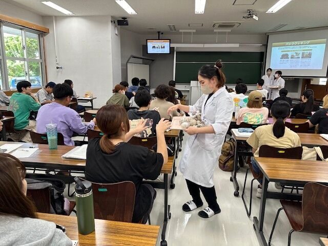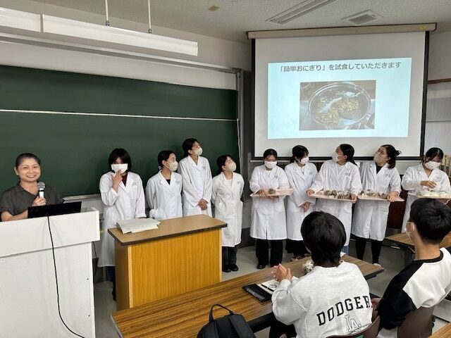 本日(10月9日)の「戦後の世界」(オムニバス科目)では災害に備える重要性について國仲先生が講義を担当し、授業の中で実際に防災食を試食するためにゼミ生たちが100食のジューシーおにぎりを作り、受講生に配りました。今回はコーンとひじき、ポーク入りのおにぎりです。試食した学生たちからは、「とてもおいしくて昼食を食べたあとだったのにパクパク食べてしまった」、「すべて缶詰で手軽に作れる調理法が参考になった」といった感想が寄せられていました。