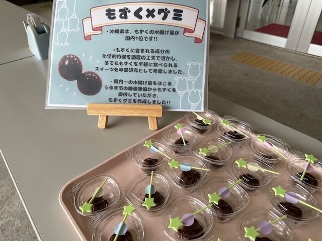 10月15日、管理栄養学科下地みさ子先生の4年次ゼミ生が考案したモズクグミの試食会が開催されました。