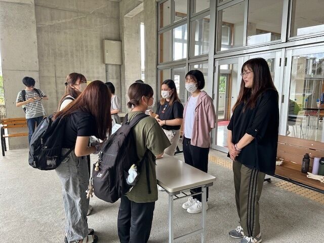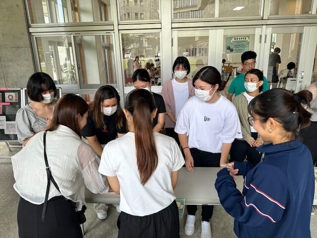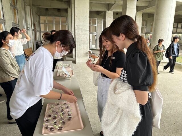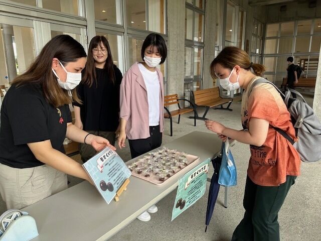 100食限定の配布イベントのため、配布時間の12時前から楽しみにかけつけた学生もいました。試食した学生からは「おいしい!」「面白い!」の声が聞かれ、レシピを考案した管理栄養学科4年次の知念茅友楽さん、友利ひかるさんは、「面白いと言ってもらえたのがとても嬉しかったです、イベントを開催できて良かったと思いました」と話してくれました。