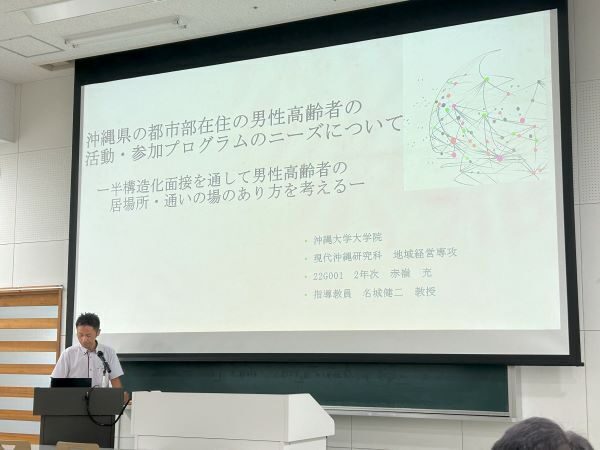 赤嶺充さん(地域経営専攻2年)は、「沖縄県都市部在住の男性高齢者の活動・参加プログラムのニーズについてー半構造化面接を通して男性高齢者の居場所・通いの場のあり方を考える-」と題し、福祉サービスを利用していない一人暮らしの男性高齢者の生活実態を調査し、生活上の困り感などを発表しました。今後は、男性高齢者の居場所作りの方法などについて研究を重ねていくとのことでした。