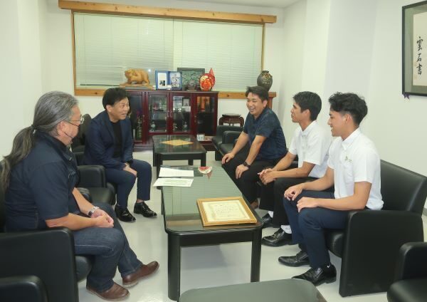 式には、福祉文化学科健康スポーツ福祉専攻3年の金城幸太郎さん、伊波琉太郎さん、そして玉城祥悟監督が参加。同窓会からは棚原勝也会長と島袋格副会長が参加して派遣費補助金を贈りました。