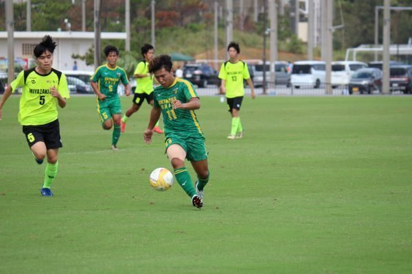 前半8分、ディフェンスの間を抜けて先制点を相手に許してしまうも、果敢に攻め、沖大の攻撃が相手ゴールを脅かします。そして前半15分、ゲームキャプテンの辺士名亘(4年)が放ったシュートがゴールを捉え1点。その後チームは勢いをつけ、前半24分に辺士名は2点目も決めます。そして前半終了間際の43分に相手のファール後、金城来偉(3年)がダイレクトシュートで3点目を決めました。キーパーの好セーブもあり、後半を守りぬき、後期初勝利を収めました。