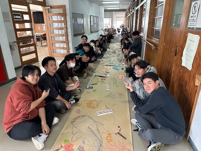 11月7日3限、こども文化学科吉村壮明先生の講義「図画工作科教育法」では長大(900m×10m)な再生紙に自由に描く、実践授業が行われていました。