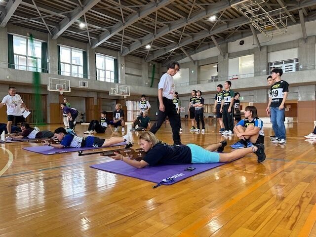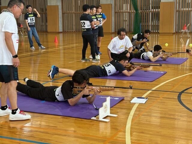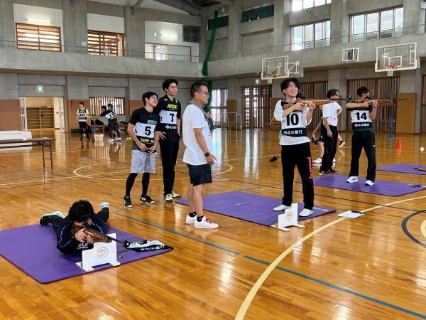 福祉文化学科准教授の石原端子先生がコーディネーターを務め、昨年はじめて沖縄で開催され、今回は昨年参加した学生が運営をサポートしました。一般の参加者と石原ゼミ以外の本学学生も参加した会では、チームに分かれて射撃体験や後半は学生が考案したオリジナル競技を楽しみました。