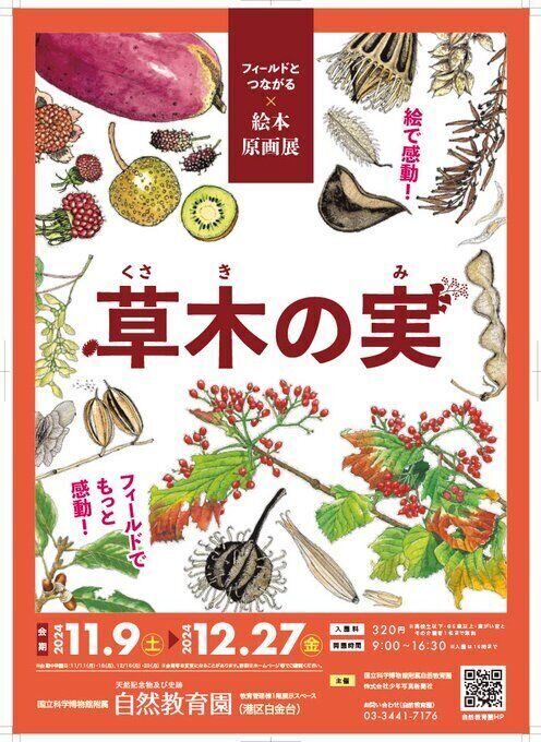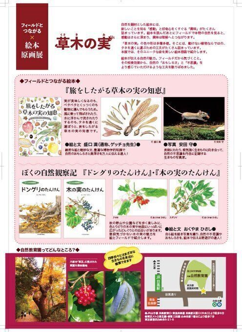 11月9日(土)から12月27日(金)まで、東京都港区白金台にある、国立科学博物館 附属自然教育園にて、企画展「フィールドとつながる×絵本原画展『草木の実』」が開催されています。盛口満先生の「旅をしたがる草木の実の知恵〜ゲッチョ先生の草木の実コレクション」の絵本原画や、絵本の中に掲載されている安田守先生の写真が展示されています。