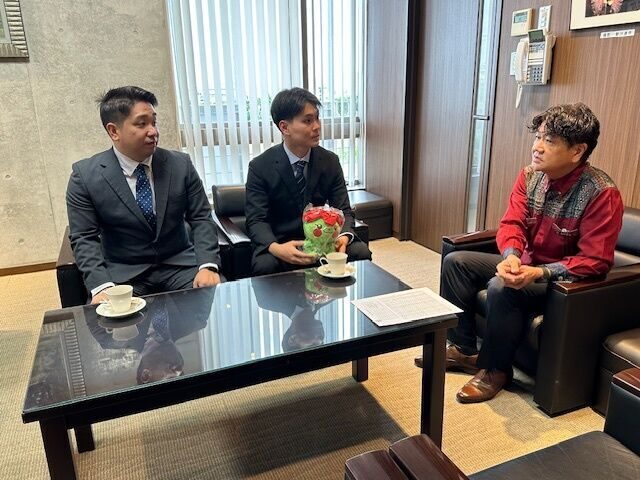 11月29日、福祉文化学科3年の國吉翔太さんが出身地である西原町の崎原盛秀町長を訪問、来月からの国際親善試合に向け意気込みを語りました。