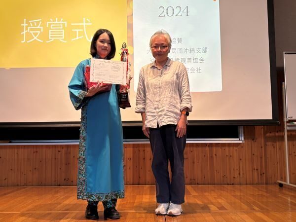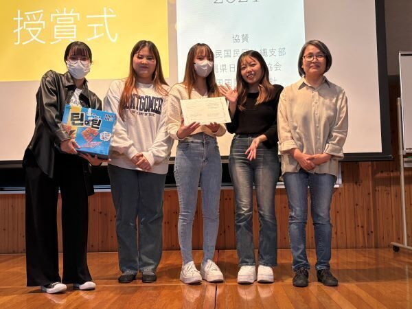 厳正なる審査の結果、中国の宋の時代の詞「釵頭鳳」をスマホのアプリで作った二胡の調べに乗せて朗誦した国際コミュニケーション学科2年生の上運天美鈴さんが優勝。2位は日本語でYOASOBIの「夜にかける」を流暢な日本語と美しい歌声で披露したベトナムからの留学生・NGUYEN PHAN GIA HAN(グエン・ファン・ジャ・ハン)さん、3位には韓国語で沖縄の伝統文化についてプレゼンをした4人グループ・ホンネジャメが選ばれました。