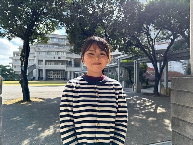 高校時代から日本語教員を目指していて沖縄大学に進学したので4年間で目標としていた試験へ合格ができて嬉しく思います。沖縄大学は日本語を主専攻で学べる県内で唯一の大学ですし、留学生との交流も多くできました。日本語のおもしろさを感じて勉強を重ねてきましたが、昨年から日本語教師としてアルバイトをしているので最近は教える難しを痛感しています。ですが、準備して教えたことが相手に伝わると嬉しくてやりがいを感じます。資格があるといろいろな場所で働けるのが魅力ですから将来的には海外で働きたいと思っています。海外の方に日本語を教えるため、沖縄の文化などの知識も必要かと副専攻で沖縄学も履修しています。沖縄の文化や歴史についても広めることができたらと思っています。