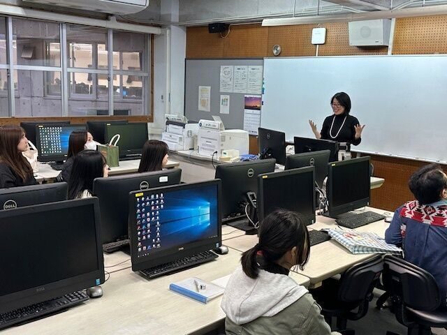 1月9日、国際コミュニケーション学科渡邉ゆきこ先生と天野裕子先生、末吉綾乃先生の合同ゼミでは、卒業生の大迫祥子さんを招いて、社会人に必要なスキル等について講話をいただきました。
