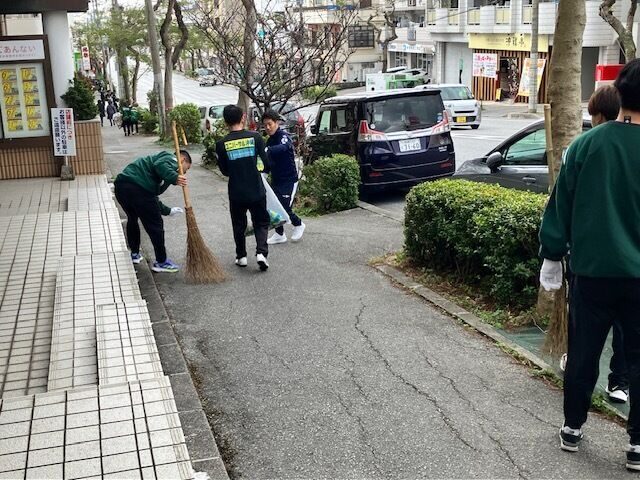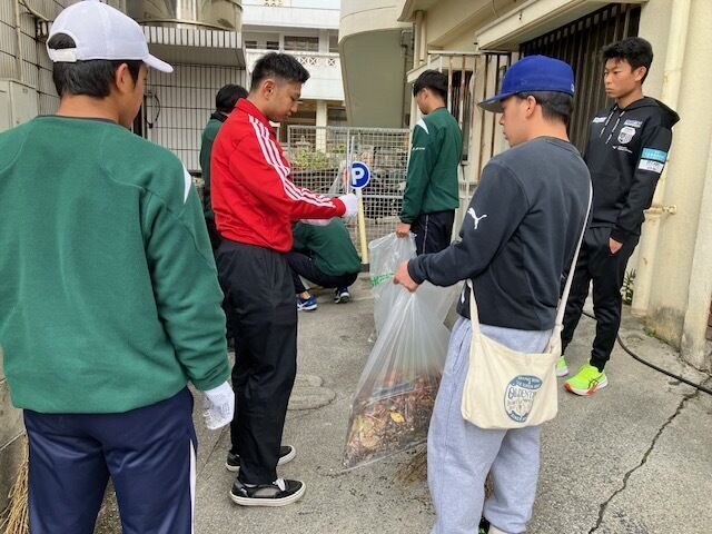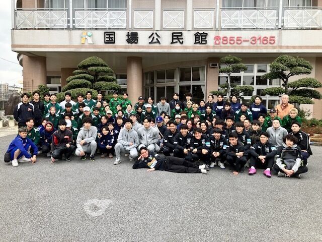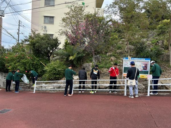 国場地区自治会との連携として行っている清掃ボランティア活動は今年で2回目となります。今回も100名が5班に分かれて大規模な清掃活動を行い、約2時間の間に多くのゴミを拾うことができました。字国場自治会嘉数正秋会長からは、「寒い中、活動に参加してくれてありがとうございました。ゴミも拾って心も身体も温かくなったことでしょう。こういうボランティア精神が部活や就職活動に活かせると思うので今後も頑張ってください」と激励の言葉をいただきました。