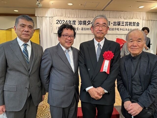 祝賀会には、山代寛学長や仲地博元学長、金城敬常務理事がかけつけ、賞受賞について喜びを分かち合いました。