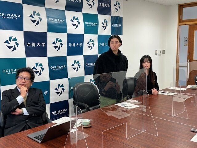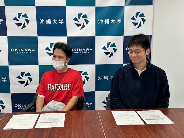 2月13日、第128回目となる記者懇談会では、体育会のUNIVAS AWRDS「優秀賞」受賞についてや 国際コミュニケーション学科・末吉綾乃先生のゼミ活動紹介、チャレンジ沖大生の話題について紹介しました。国際コミュニケーション学科の末吉ゼミを代表して吉田ひよりさん、水木萌由奈さんが参加し2022年度より英語を活かした那覇の魅力発信事業の内容について発表し、今年度の成果について、来年度に向けての紹介を行いました。県外出身の2人が制作した那覇市の自然や景色についての動画制作についてはゼミ内や那覇市観光協会の方にも沖縄に住んでいると気付かない視点だったと好評だったことや実際に外国人の方に首里城下町を紹介したマップを配布した際に喜んでもらえたことなどを紹介しました。母校南風原高校で高校生と紅型制作を行っている赤嶺耕平さんの企画についても紹介、地域と共に学びを深めあう沖大の取り組みについてPRをしました。