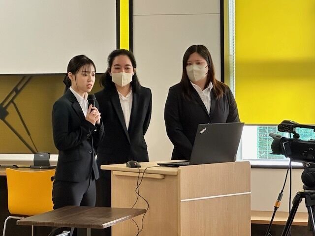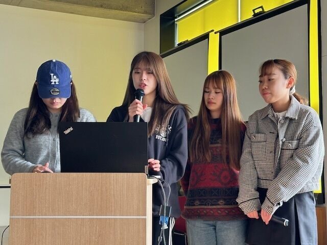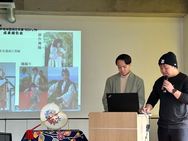 中でも琉球芸能に携わっている4年次の仲間功也さんと亀山飛龍さんは3年間琉球弧研究に取り組み、1年目は藍染、2年目は花笠、そして今年度は紅型についてと、舞台衣装や小道具といった琉球工芸の職人さんからお話をきき、自らも制作に関わるなどの活動から、踊りや三線を通して舞台での表現方法に深みが増してきたとの実践報告もありました。山代寛学長からは、「様々なテーマに着目して地域をフィールドにし、学び深めていることがとても沖縄大学らしく素晴らしく感じている。継続して研究を続けていっていただきたい」とエールが贈られました。