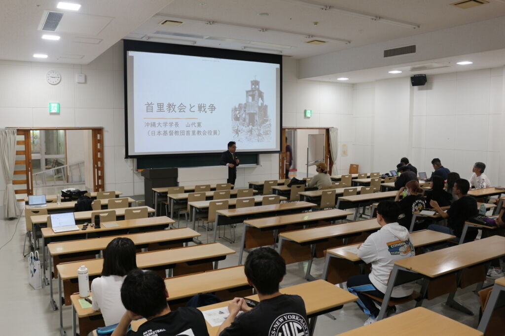 【1日目】初日は、沖縄戦について理解を深める講義が行われました。沖縄大学の創設者である嘉数昇の「すべての人が学べる大学を沖縄に」という想いが平和への強い願いと結びついていることが語られました。「首里教会と戦争」の講義では、沖縄戦で首里教会が激戦地となり、戦火で廃墟となった歴史が紹介され、首里教会の再建や沖縄社会における役割が語られました。