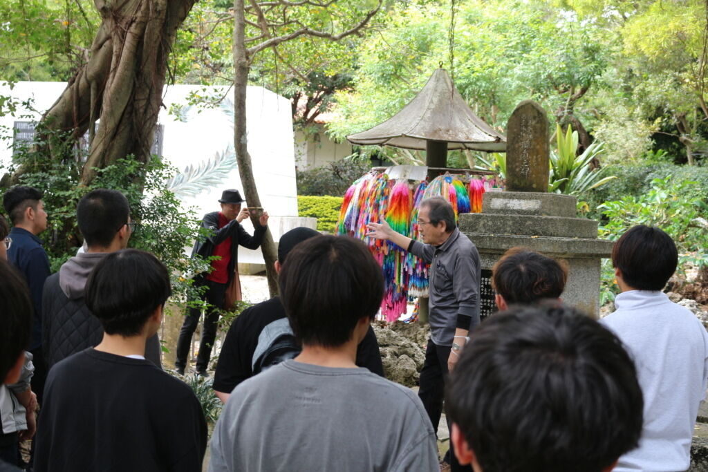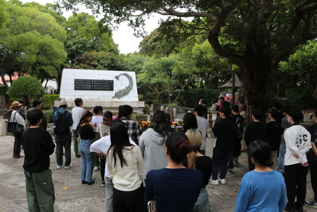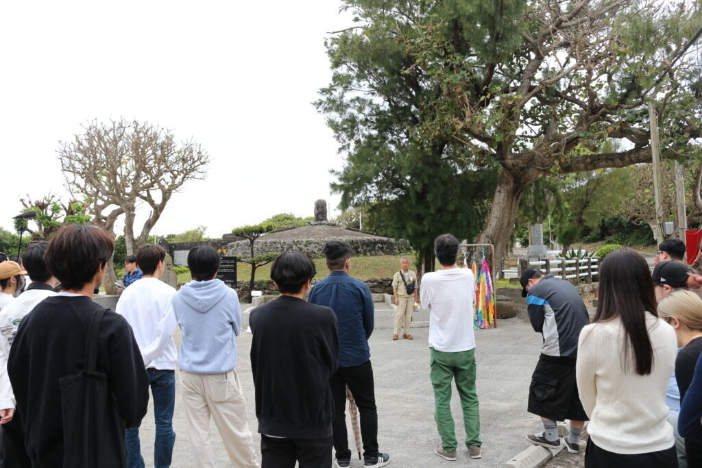 【2日目】2日目は、フィールドワークとして那覇市真嘉比や糸満市米須などの戦跡を巡りました。那覇市真嘉比の「ハーフムーンヒル跡」では、日本兵の遺骨が発見された現場が紹介され、戦時中の壮絶な状況が学生たちに伝えられました。糸満市の「魂魄の塔」では、沖縄戦で亡くなった多くの人々へ黙祷が捧げられ、その場所が持つ重みを感じ取る機会となりました。ひめゆりの塔では、戦時中に動員された学徒隊の歴史が語られ、戦争が若者に与えた影響について理解を深める貴重な時間となりました。