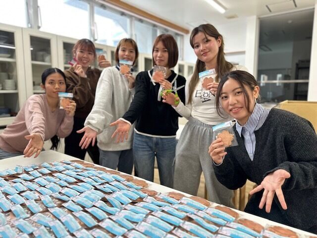 今年もクッキングサークルが考案したレシピでお菓子を製作、入学式で新入生ひとりひとりに贈られました。『~祝春~サクラサブレ』はサクラ色と味にもほんのり桜を感じられるお菓子となっています。