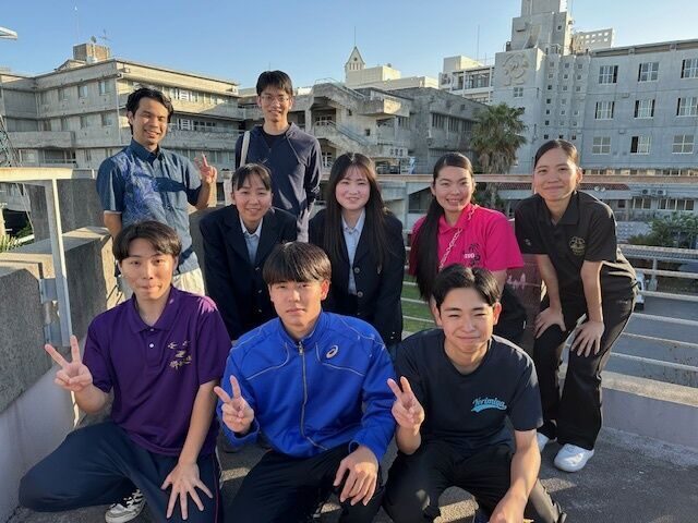 4月7日、経法商学科3年次の赤嶺耕平さんと糸数昌瑛さんがチャレンジ沖大生企画(紅型プロジェクト)で交流中の南風原高校の生徒7人が本学を訪問し、制作内容をまとめた写真つきのパネルを赤嶺さんに贈呈しました。赤嶺さんらは、1月より母校である南風原高校で紅型の帯やタペストリー制作に取り組んでいて、完成した帯を、現在、本学本館1階で展示しています。展示ブースに高校生がまとめたプロジェクト内容も展示してほしいとの希望があり、今回の訪問となりました。