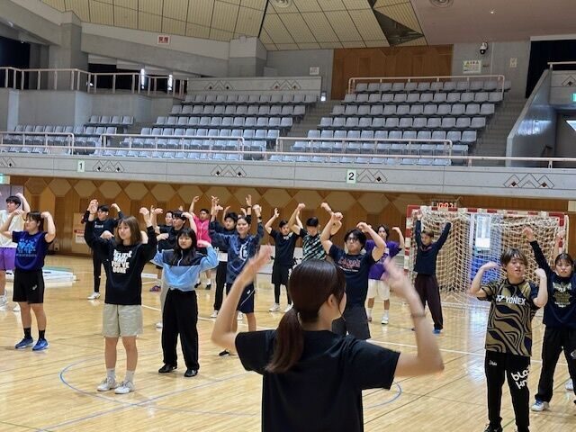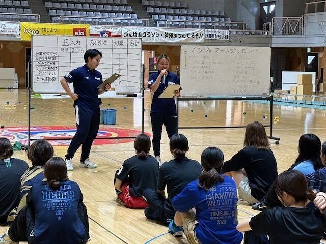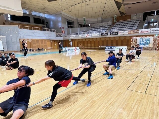 中山ゼミでは昨年度からコラソンファンを増やそうとイベントのプロモーションを行っています。昨日は試合前に、学生対抗運動会や企業説明会を開き、スポンサー企業から提供された豪華景品を用意するなど、集客を試みました。司会担当の比嘉芙女さん、宮里心瀬さんのテンポ良いアナウンスで会場を盛り上げ、運動会は工夫を凝らした三種目に挑戦してもらいました。綱引きには琉球コラソン代表取締役CEOの水野裕矢さんも急遽参戦するなど、接戦となる展開に会場は大いに盛り上がりました。その後の企業説明会では、企業の魅力を身近に感じられるようにとアットホームな雰囲気の中で説明が行われ、スタンプラリー形式を導入して、すべての企業の説明をきいた学生は試合終了後の抽選会で商品を獲得できるようにしていました。約半年をかけてイベントを終えた運営メンバーの4人(比嘉 芙女さん、宮里心瀬さん、金城 涼夏さん、渡邉來心さん)は、「達成感しかないです。一番大変だったのは人集めだったので、今日、多くの学生が参加してくれて良かったです。運動会は競って、盛り上がってくれて、参加者のみんなが楽しんでくれて良かったです。ご協力いただいた企業の方々の声等を活かして、また中山ゼミとして連携イベントが開催できると嬉しいです」と感想を話していました。