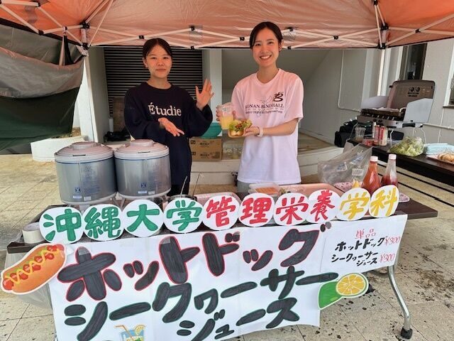 会場入り口では、管理栄養学科國仲小織先生のゼミ生がホットドッグとシークワーサードリンクを販売、中山ゼミの奮闘イベントに華を添えていました。