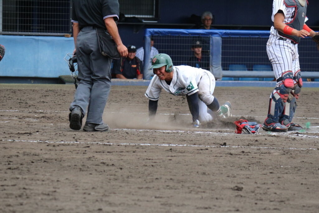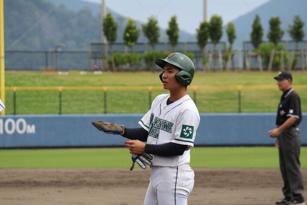 硬式野球部は4月26日、27日、沖縄国際大学との試合に挑みました。26日は2対3で敗れ、絶対に落とすことができない最終戦。4回に相手チームの7番の三塁打で1点を与えるも、7回4ボールで6番山城が出塁し、1番の中村のライト前ヒットで同点とし振り出しに戻します。投手陣は宮城、津波幸志郎、津波辰弥でつなぎ得点を最小限に抑え迎えた9回、相手の7番のライトオーバーで追加点が入れられ、その裏、7番山城のセンター前ヒットで2塁まで進みましたが、一歩及ばす、沖縄国際大学に2敗の結果となり、九州大会への出場は叶いませんでした。