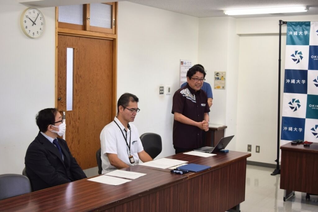 式には、本学から山代寛学長、経法商学部金城秀樹学部長、谷口友一学科長が出席、沖縄税理士会からは松川吉雄会長、友寄亜由子広報部副部長、伊東大輔事務局長が参加しました。挨拶で山代学長は「昨年度に引き続き、税に関する寄付講座を開講いただくことはとてもありがたい、一人でも多くの学生が税理士を目指せるよう支援していきたい」とお礼の言葉を述べました。松川会長は税理士の業務は人間の多様な働き方にマッチングするような業種であると述べ、「講座を通して税理士になりたい、税理士事務所の職員になりたいと志望する学生が増えることを期待したい」と抱負を語りました。