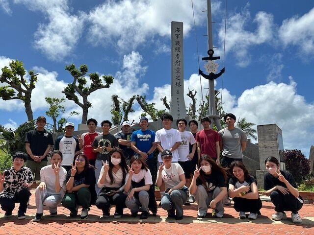 経法商学科教授の前田舟子先生のゼミでは、琉球史を学ぶフィールドワークを定期的に行っています。5月16日は、第二次世界大戦中末期に日本海軍の司令部壕がおかれ激しい戦場であった戦跡公園を訪れ平和学習を行いました。前田ゼミ専門演習a(3年次ゼミ)は、北部出身の学生が多くいることから、南部の悲惨な戦争について学びたいと、ゼミ生の比嘉良多さんと古我知翔太さんが発案したものです。ゼミ生19人は資料室で沖縄戦の資料や遺品に触れ、その後、約4000人が収容されていた地下陣地、旧海軍司令部壕を見学しました。すべて人の手で掘られた壕内通路を進み、モールス信号の機械や発電機、幕僚が手榴弾で自決した時の破片のあとなど、当時のまま残る壕のなかを見て、学生たちは改めて平和の大切さを痛感した様子でした。
