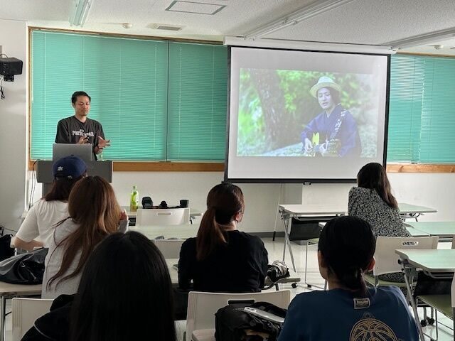 5月20日、国際コミュニケーション学科Miltiadis Beratlis先生のゼミ(基礎演習Ⅰ・2年次)では、ゲスト講師を招いてSNS、動画配信について学びました。今回のゲスト講師は、オリジナル革製品を扱う「Anshare」オーナーで動画クリエイターの上原奨太郎さんです。上原さんは好きな写真を活かして、お店のホームページを手掛け、現在はミュージックビデオ撮影や映画撮影など、動画制作にも力をいれていて、SNSのフォロワー数は70万人を上回っています。