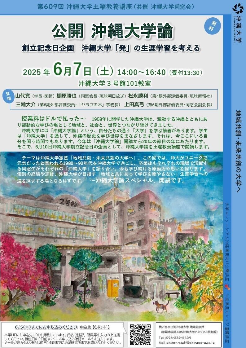 第609回沖縄大学曜教養講座「公開 沖縄大学論 創立記念日企画 沖縄大学『発』の生涯学習を考える」開催のお知らせ 6月7日(土)14:00~16:40