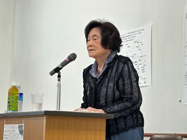 翁長さんは、県立第一高等女学校に通っていた15歳のときに、沖縄戦を体験し、旧日本軍の部隊と行動をともにして看護や炊事を担っていました。80年前の5月末、首里城近くの安国寺に身を寄せていた翁長さんはアメリカ軍の攻撃を受け、背中に傷を負いながら、首里から南部へと逃げさまよったそうです。戦時中に何度も死に直面し、それでも生きることができた命、その命が続くかぎり、戦争のむごさ、平和のありがたさを伝えつづけている翁長さんの姿に、参加した約50人の学生や高校生は、確実になにかを感じとった様子でした。講演終了後も翁長さんのもとには多くの学生さんが感謝の言葉を伝える姿がありました。