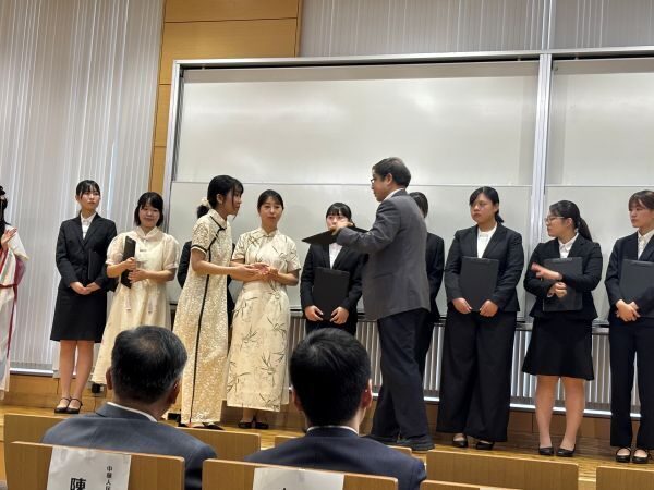 また同日、第6回全国日本大学生中国語スピーチコンテスト「国航杯」も実施され、国際コミュニケーション学科3年の上運天美鈴さんが優秀賞を受賞しました。上運天さんの作文は、「天下一家(世界はひとつの家族)」の共通テーマ、台湾での留学経験を通して感じた文化の違いや、人と人とのつながりについての気づきを丁寧に綴った内容で、心温まるスピーチとなりました。
