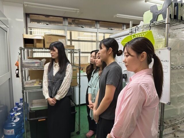 6月3日、管理栄養学科下地みさ子先生の専門演習ゼミ(4年次)では、アップサイクルメニューでコラボ企画を進めているオイナリアンさんの工場見学を行いました。下地ゼミでは2022年度からオイナリアンさんへ、新商品のプレゼン等を行ってきて2024年度からは廃棄予定の油揚げをリメイクした「油揚げきな粉味」が商品化され店頭販売されています。この日はオイナリアン吉里時浩社長に説明をいただきながら工場見学を行いました。