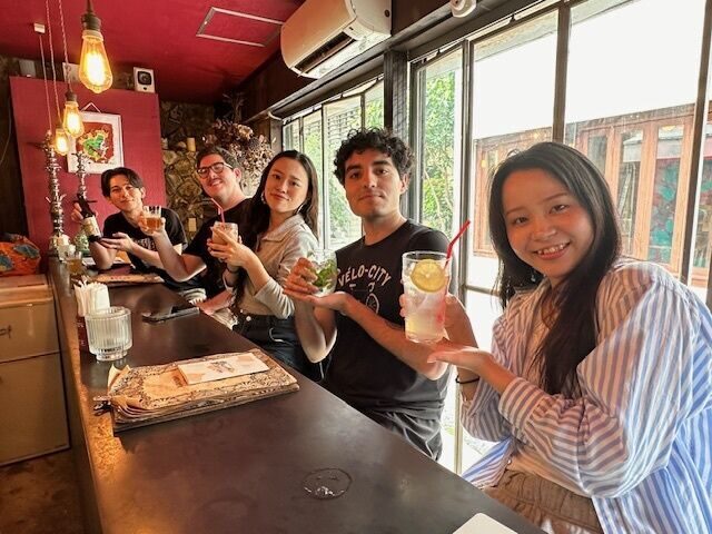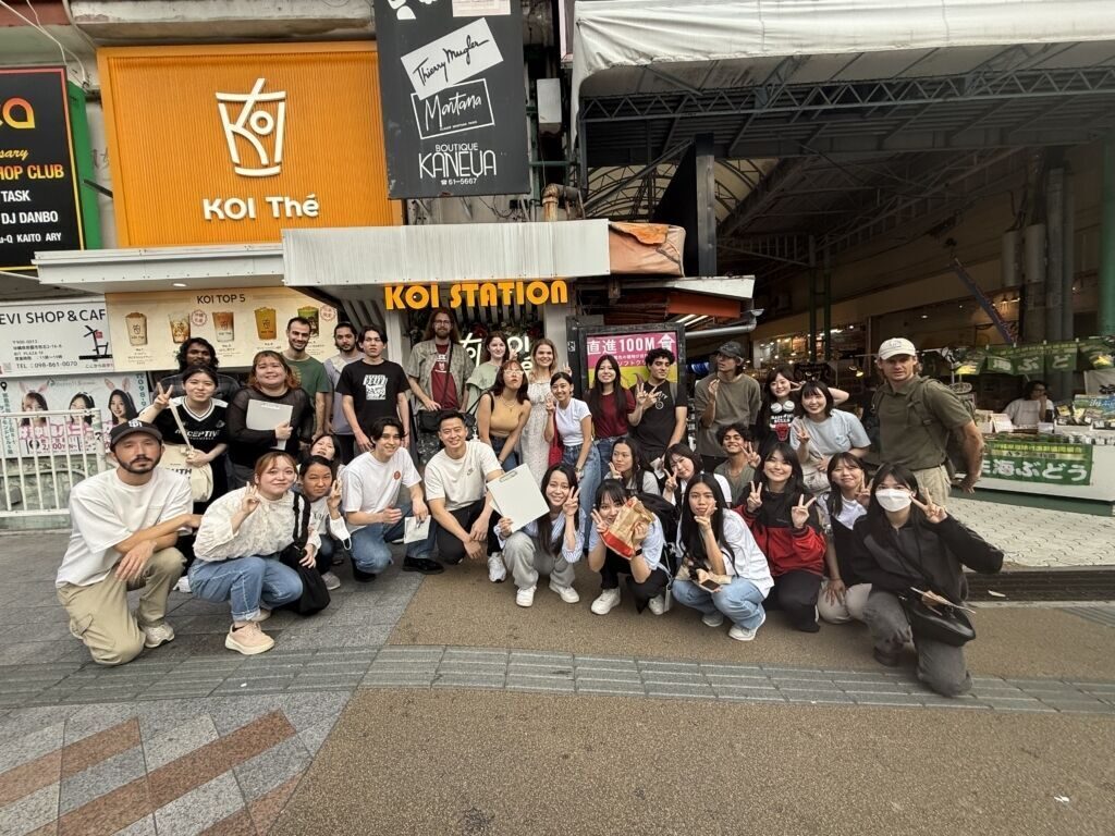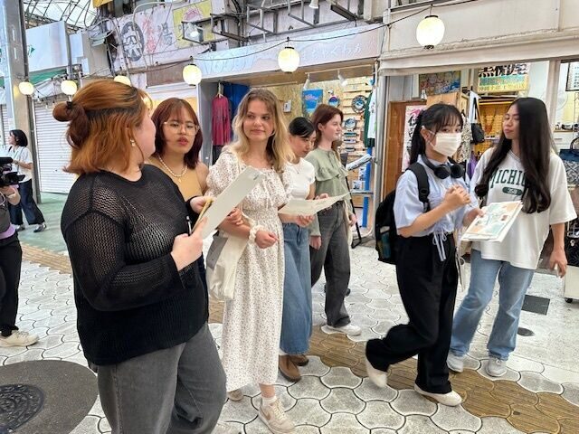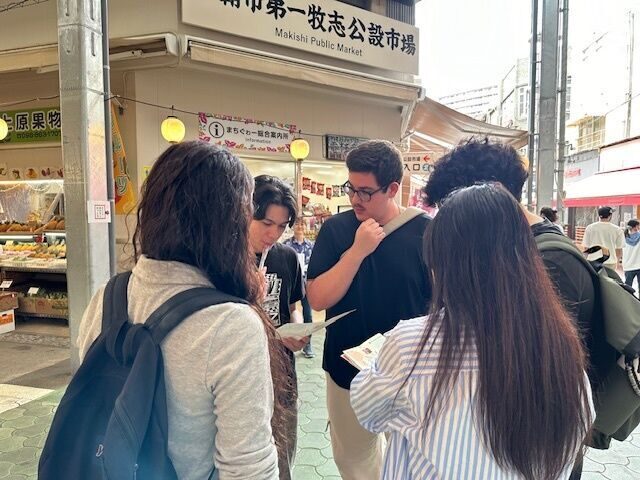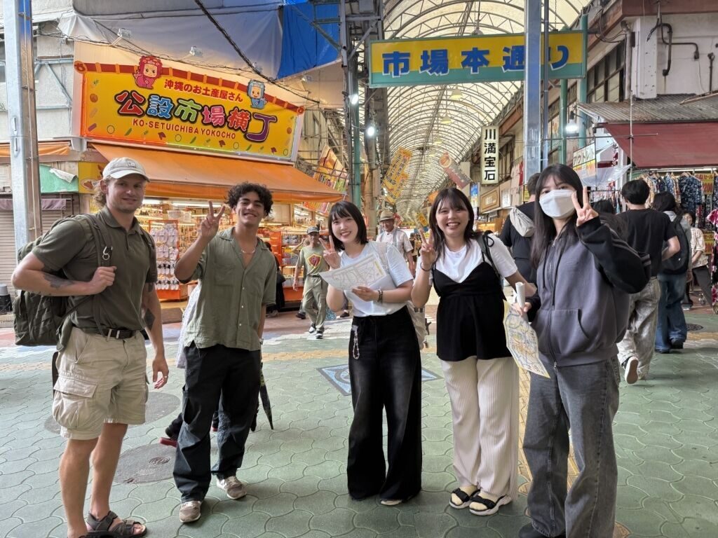 末吉ゼミでは2022年度より那覇の魅力発信事業に取り組んでいて、英語を活かして、動画制作やSNS発信、マップ作成を行っています。今回は、市場通りのマップを作成中で、外国のかたのニーズ調査として、日本語学校(国際言語文化センター附属日本語学校(ICLC Okinawa Japanese Language School)の学生さんにも参加いただき、交流しながら散策しました。