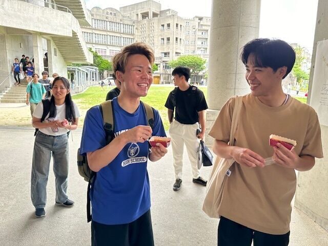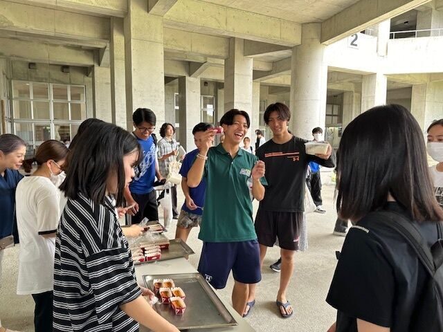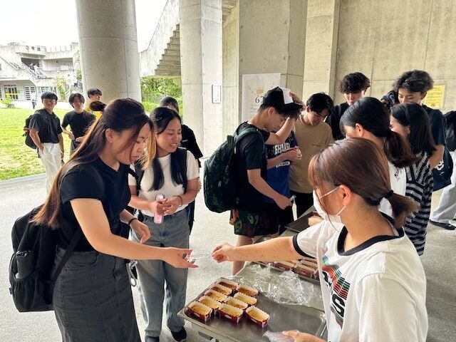 創立記念日を祝して、クッキングサークルのみなさんがレシピを考案し試作を重ねた、島豆腐ベイクドチーズケーキ限定100食をお昼休みに配布しました。学生の趣旨に賛同いただいた西原町にあります池田食品さんに材料となる豆腐をご提供いただきました。