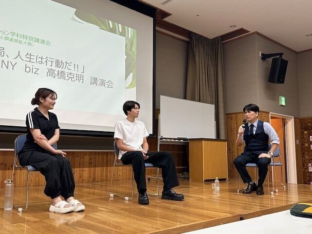 高橋さんが学生にインタビューしたり、逆に学生からの質問にこたえたりしながら講演会はすすみ、「ニューヨークで仕事をするため、英語の勉強はどうしたのか」や「著名人にインタビューするときに緊張しないのか」、「高橋さんの原動力は?」、「めんどくさいを克服する方法は?」など次々と学生からの質問が寄せられ、最後まで学生たちはとても熱心に聞いていました。