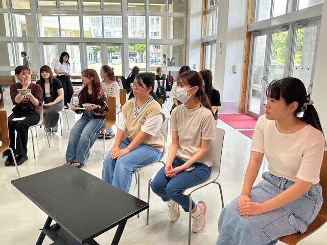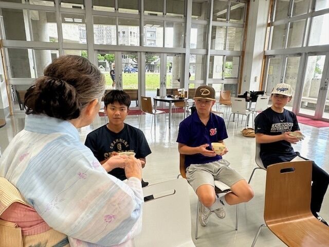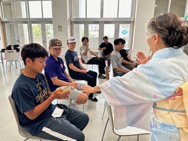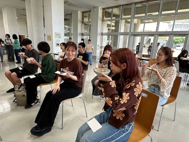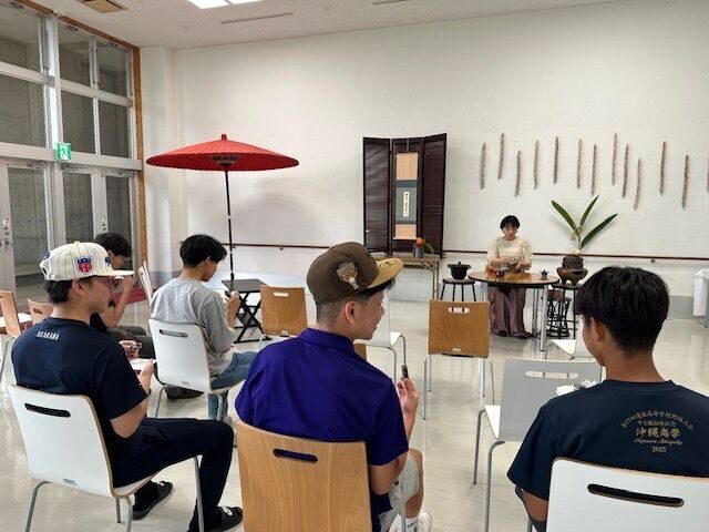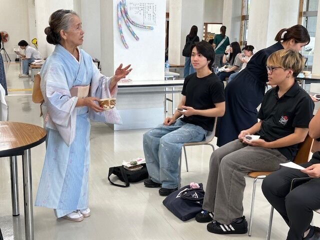 お昼休み時間に開催された茶会は、裏千家山田宗民教授にご指導いただき、慰霊の日をまえに鎮魂の想いを込めたしつらえについて、掛け軸やお花、お茶碗の意味等、説明を受けながら学生たちはお菓子と抹茶をいただきました。参加した学生たちは、「本格的な抹茶をいただくのは初めてでとても良い経験でした」、「初めての茶会体験で緊張しましたが、お菓子もお茶もとてもおいしかったです。穏やかな時間が過ごせました」と感想を話していました。